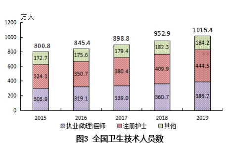 2019年末卫生人员总数中,卫生技术人员1015.4万人,乡村医生和卫生员84.2万人,其他技术人员50.4万人,管理人员54.4万人,工勤技能人员88.4万人。卫生技术人员中,执业(助理)医师386.7万人,注册护士444.5万人。与上年比较,卫生技术人员增加62.5万人(增长6.6%)(见表2)。